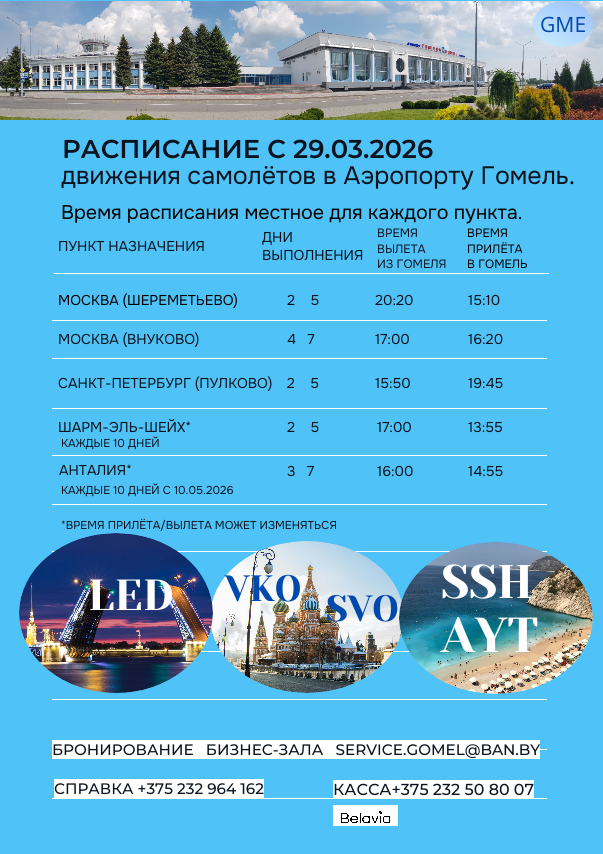 Точное время начала и окончания регистрации можно узнать заранее в справочной службе аэропорта по тел. +375 232 964162.